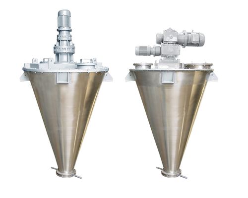 錐(zhuī)形(xíng)雙螺旋混合機,它由噴液裝置、傳動部分、筒蓋、螺旋、筒體、出料閥箱等組(zǔ)成(chéng)。